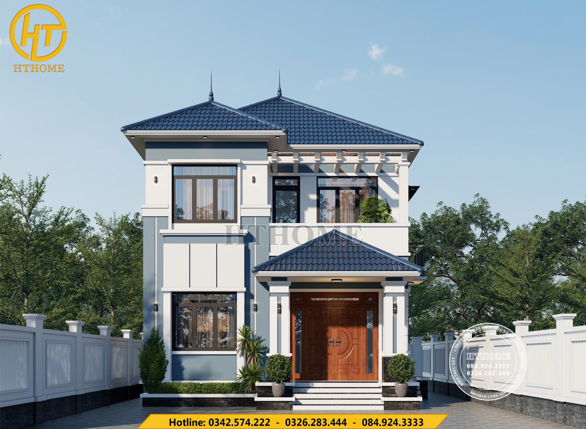 Ngôi nhà 2 tầng này mang phong cách mái Nhật hiện đại, nổi bật với tông màu trắng – xanh tinh tế, kết hợp mái ngói xanh đậm tạo cảm giác vững chãi và thanh lịch.