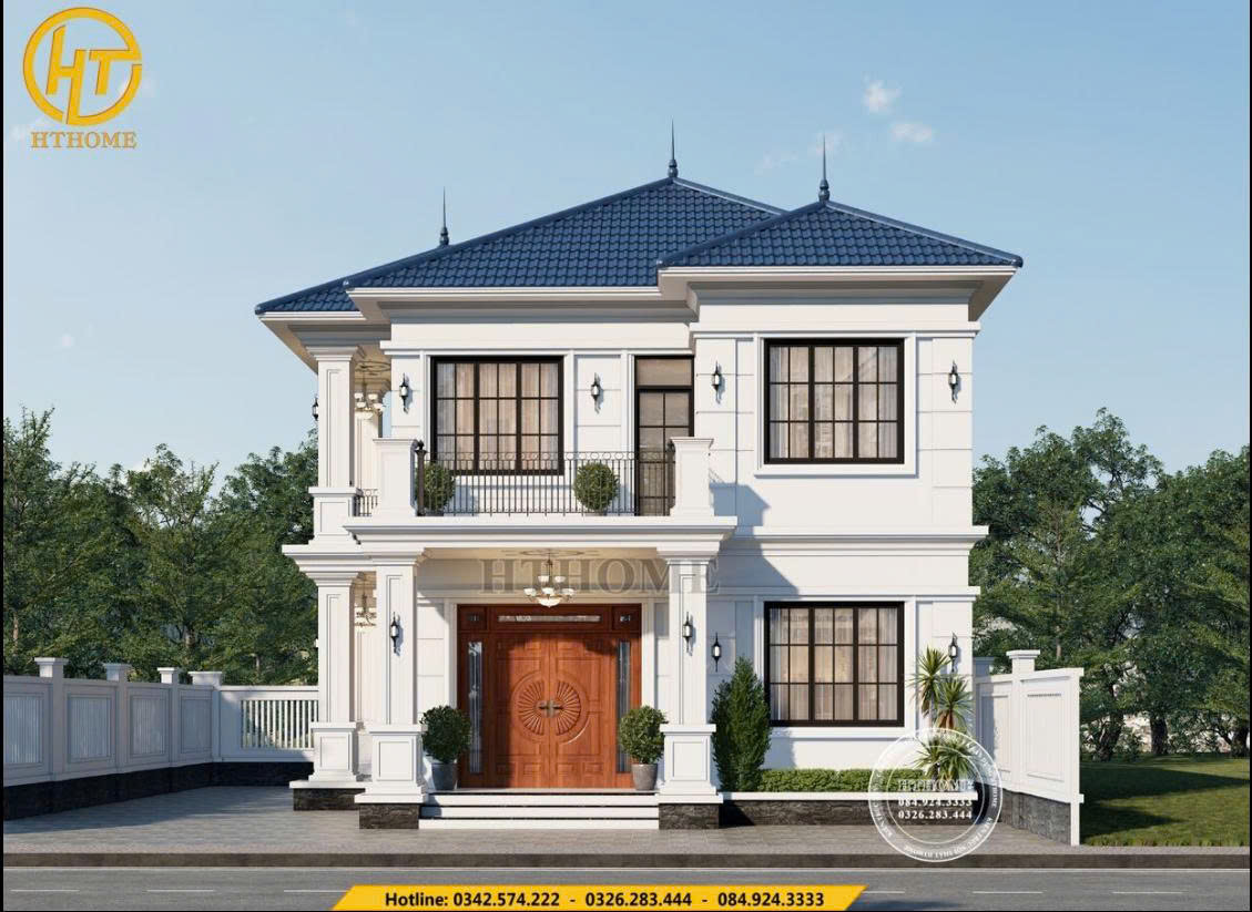 Ngôi nhà 2 tầng mái Nhật tân cổ điển, mái ngói xanh 3 đao, sơn trắng, phào chỉ tinh xảo, sảnh cột Ionic, cửa gỗ lim, ban công rộng, cửa sổ lớn – sang trọng, bề thế, hài hòa.