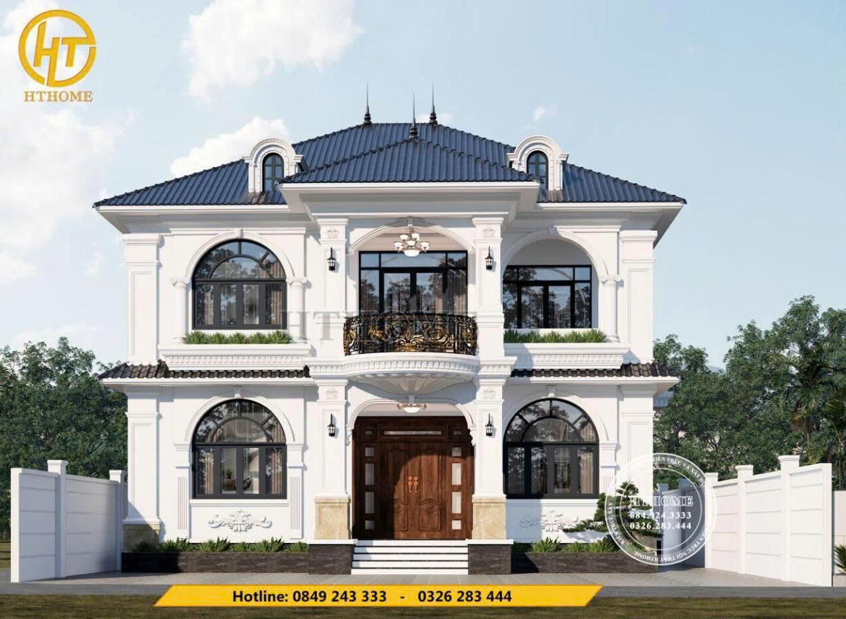 Ngoại thất ngôi nhà, mặt tiền đối xứng hoàn hảo, cửa chính gỗ chạm khắc cầu kỳ, vòm cửa sổ cong mềm mại và ban công tầng 2 uốn lượn lan can sắt mỹ thuật mạ vàng. Tường trắng tinh khôi kết hợp đá ốp chân tường tự nhiên, tạo độ tương phản hài hòa, bề thế. Tổng thể toát lên vẻ quyền quý, đẳng cấp và bền vững theo thời gian.