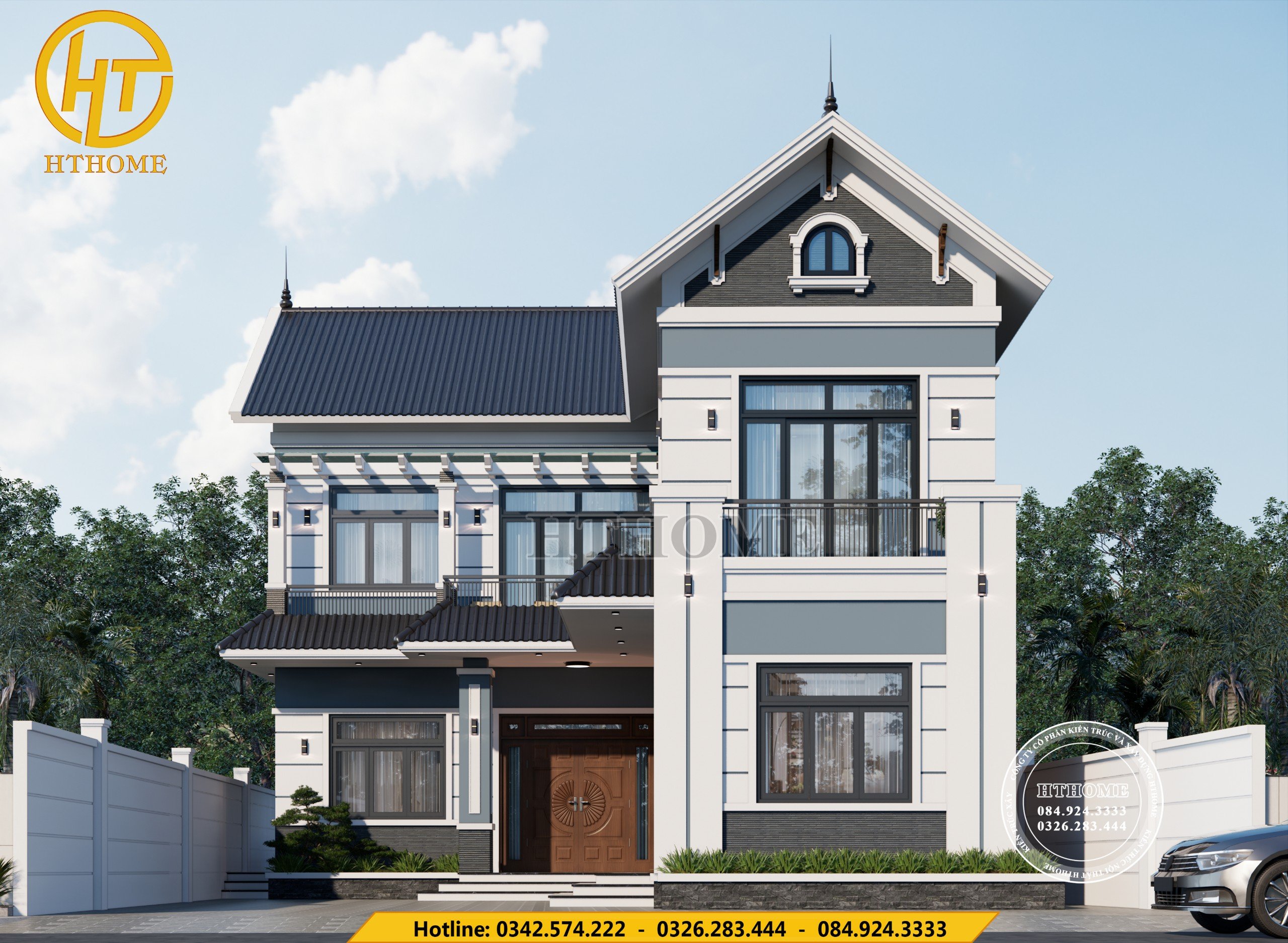 Ngôi nhà được thiết kế theo phong cách hiện đại kết hợp mái Nhật sang trọng. Tông trắng – xanh ghi chủ đạo mang lại cảm giác tinh tế và nổi bật. Hệ cửa nhôm kính lớn giúp không gian luôn thông thoáng, đón trọn ánh sáng tự nhiên. Các chi tiết phào chỉ, gờ tường được xử lý khéo léo, tạo điểm nhấn cho mặt tiền. Tổng thể công trình toát lên vẻ bề thế, thanh lịch và chuẩn phong cách sống hiện đại.
