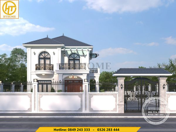 Mẫu nhà biệt thự 2 tầng mái Nhật 2025 nổi bật với sự kết hợp giữa mái Nhật thanh thoát và các chi tiết tân cổ điển đầy tinh tế. Màu sắc chủ đạo của ngôi nhà là tông màu trắng nhẹ nhàng kết hợp với các điểm nhấn màu vàng đen tạo nên vẻ sang trọng.