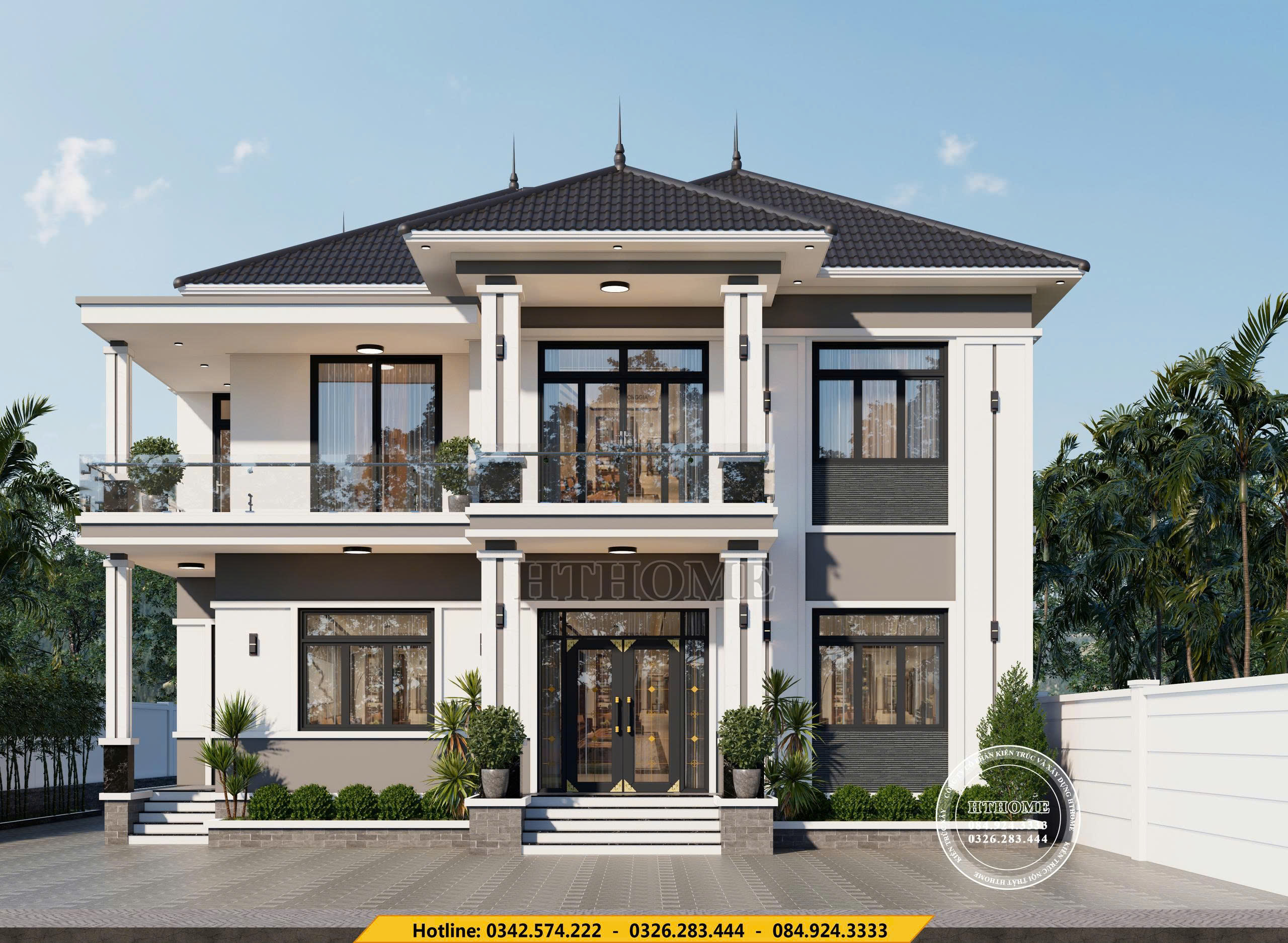 Hệ trụ cột vuông thanh lịch kết hợp mảng tường phân tầng màu sắc tạo chiều sâu cho tổng thể. Ban công kính sang trọng ôm trọn không gian tầng 2, giúp ngôi nhà vừa thoáng vừa hiện đại. Mái Nhật dốc nhẹ, cao ráo tạo nên dáng vẻ bề thế và chuẩn phong cách Á Đông. Các ô cửa lớn được bố trí hợp lý, đón sáng tự nhiên tối đa, mang lại cảm giác rộng mở và kết nối với sân vườn. Tất cả hòa lại tạo nên một mẫu nhà 2 tầng cân đối, tinh tế và đậm nét sang trọng.